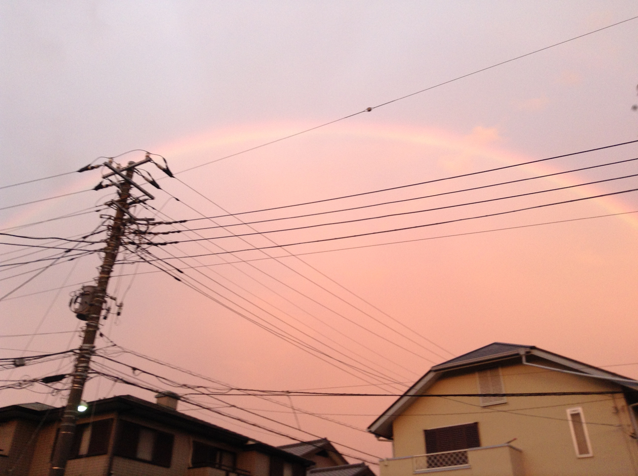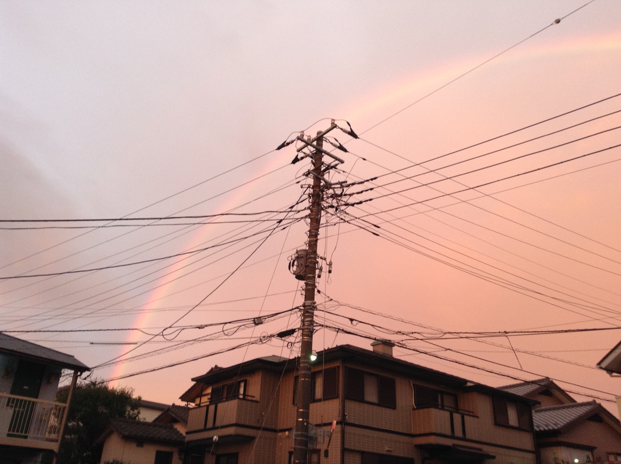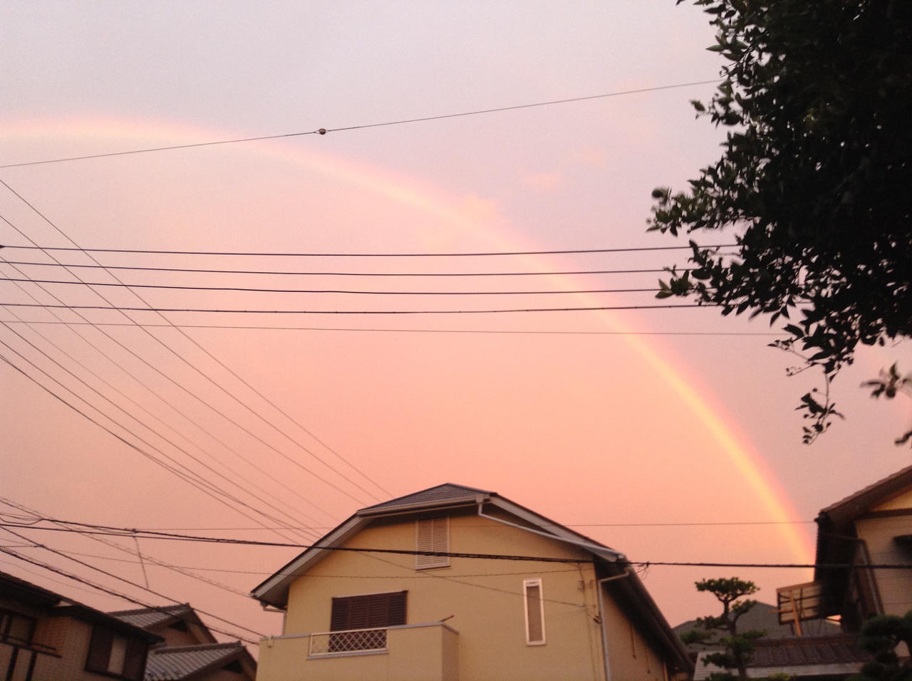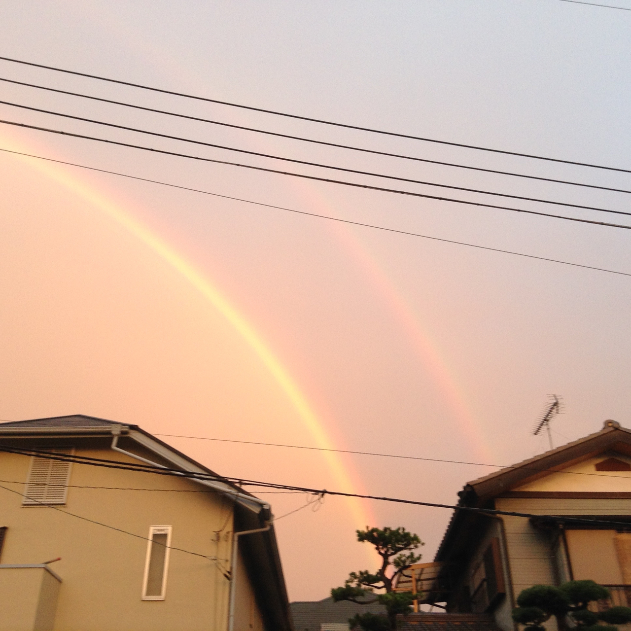 日の出方向を見ていたときは気づかなかったが、ふと西側に目をやると、もう、端から端までクッキリハッキリの虹!虹の内側は朝焼けピンク。外側は、ぼんやり青空。で、外側にもう一つ、うっすらと、でもちゃんと見れば、やはり端から端まで途切れないもうひとつの虹を発見。